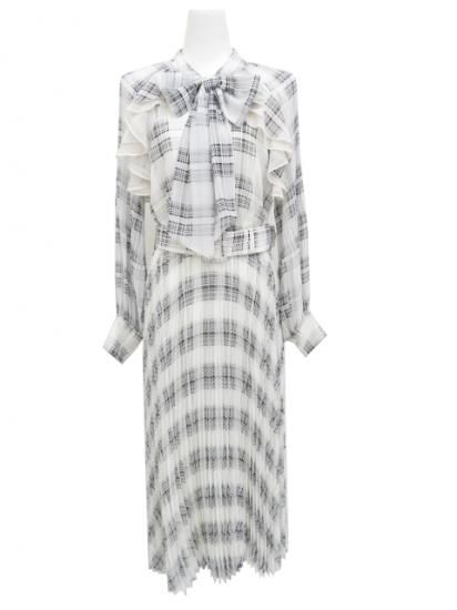 Estella.K タイ付きアコーディオンプリーツドレス ホワイト×ブラック F 未使用【中古】