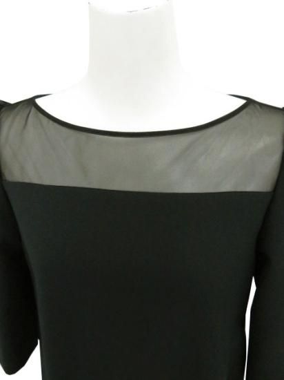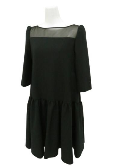 コメント '20年12月メルマガ掲載商品!さらりとしたしなやかなハリのあるポリエステル素材。デコルテの透け感が華やかな印象を与える袖付きワンピースです。ローの切替に寄せたギャザーからふんわりと広がるシルエットが魅力的。ファスナープルロゴ刺繍入り。バックファスナー、裏地あり。