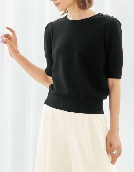 コメント しっとりと柔らかな着心地のグレースウール素材。アクセサリーに使用する上質な石を用いてハンドメイドで一つ一つ丁寧に仕上げられたジュエルボタンがポイントのニットトップスです。身頃は程よいゆとりでシンプルに、袖山はタックでバランスよくメリハリをつけ、ジュエルボタンで全体に華やかさをプラス。さりげなく洗練されたディテールが魅力的な一枚です。